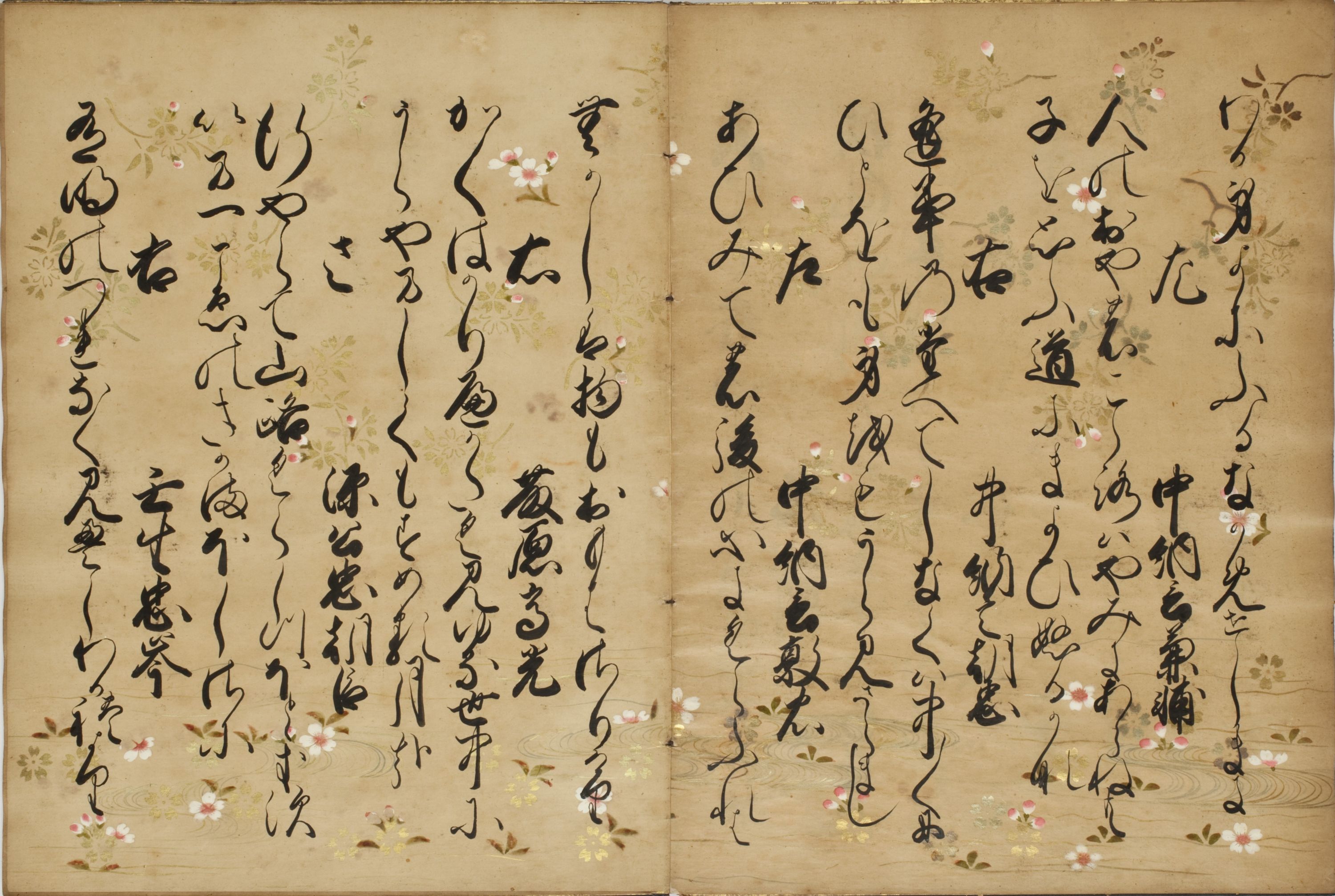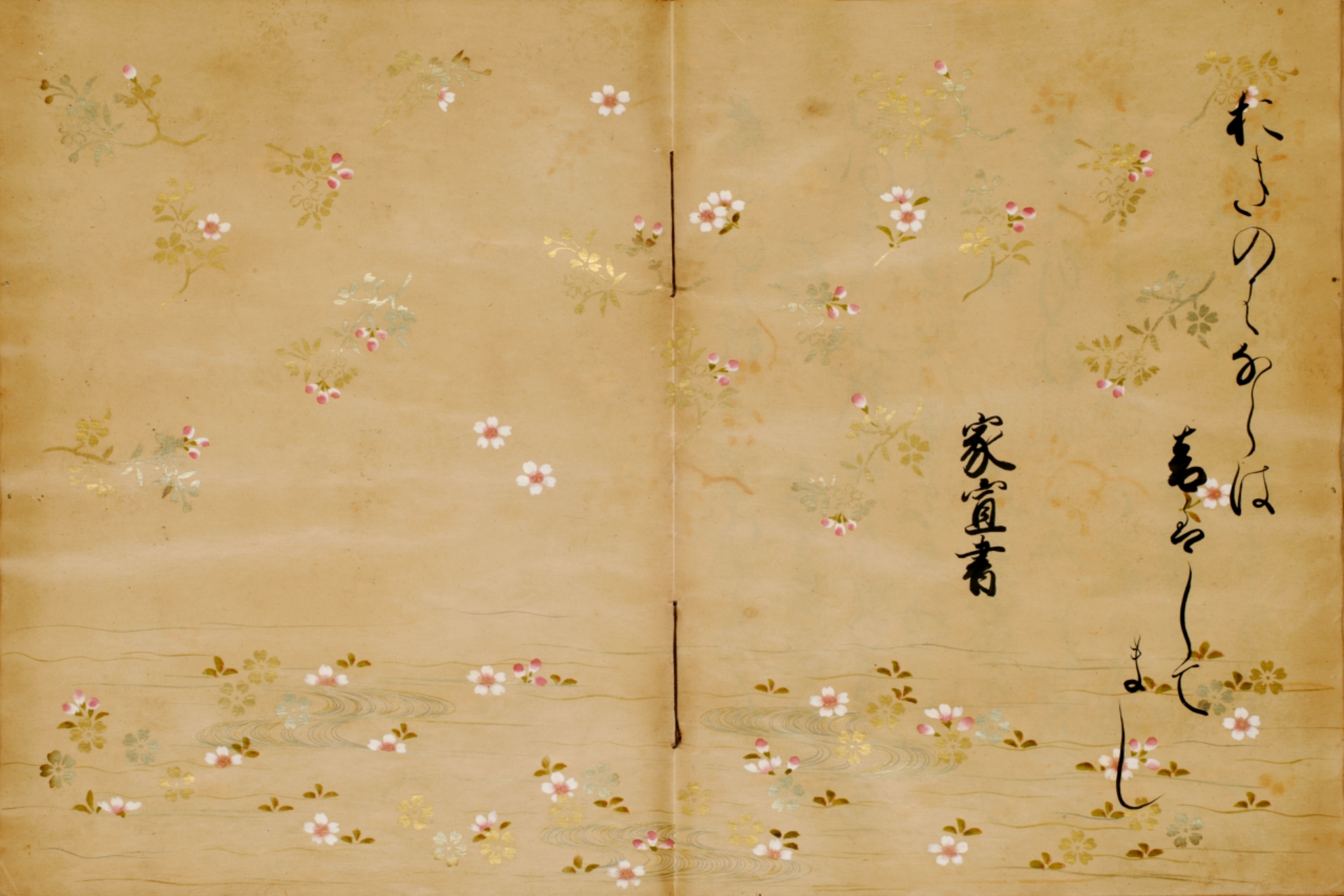 本書は徳川将軍家第六代家宣によって書写されたもので、金銀泥による流水や草花、さらに彩色された桜花を散らした愛らしくも豪華な下絵を施した美しい料紙が使用されている。