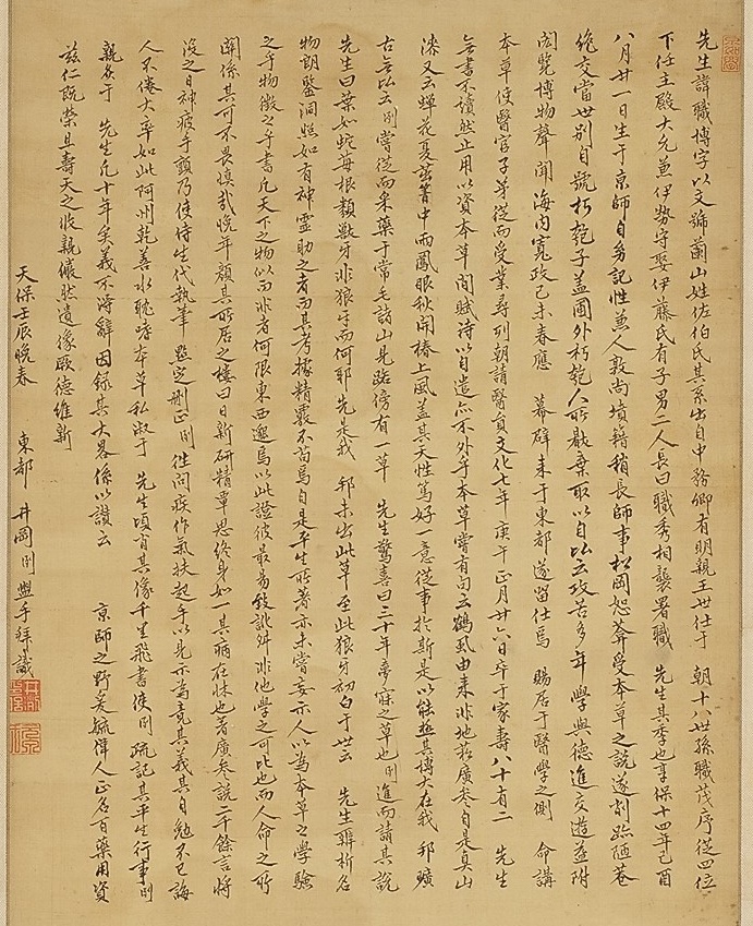 画像上部にある蘭山の書状には、十四巻・十五巻という記事があることから、書籍刊行の作業を進めている最中のものと思われ、その巻数から蘭山畢生の大作『本草綱目啓蒙四十八巻』のことと思われる。ちなみに、文政12年に再版された際の版元に江戸書肆北島順四郎の名があり、本書状の宛名の北嶋其祐と関連する人物か。